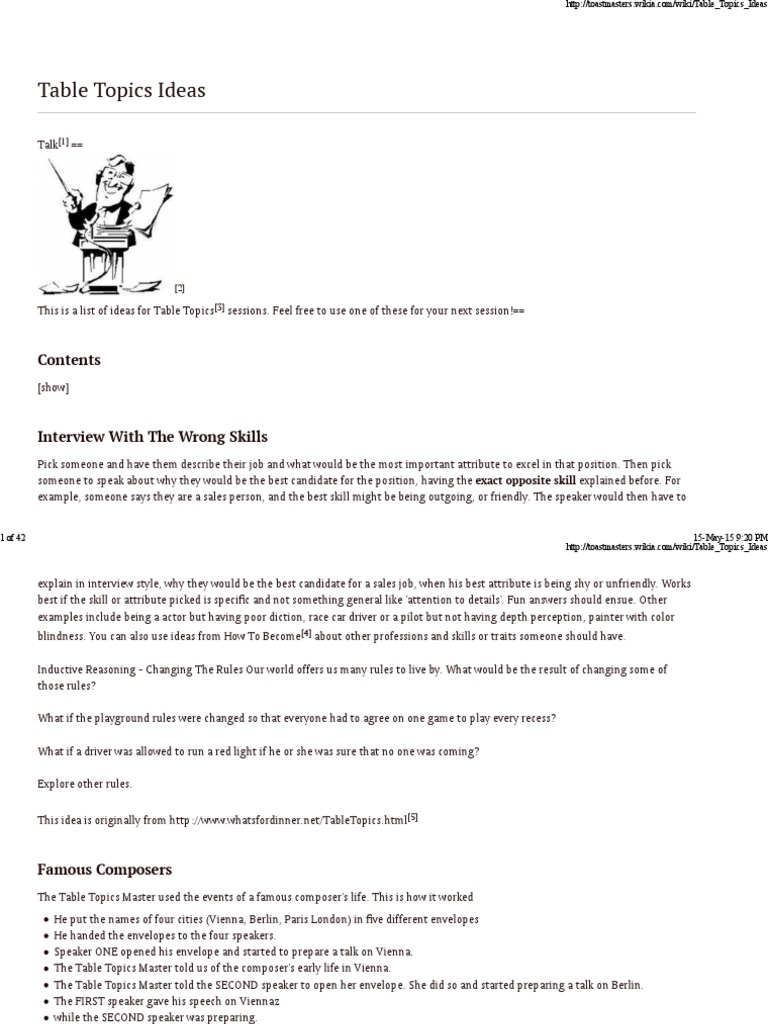 Speaker has to com. Toastmasters has table topics materials in the catalog including 2 sets of questionsmaterials for table topics. Many of the ideas were duplicates and the origin unknown.